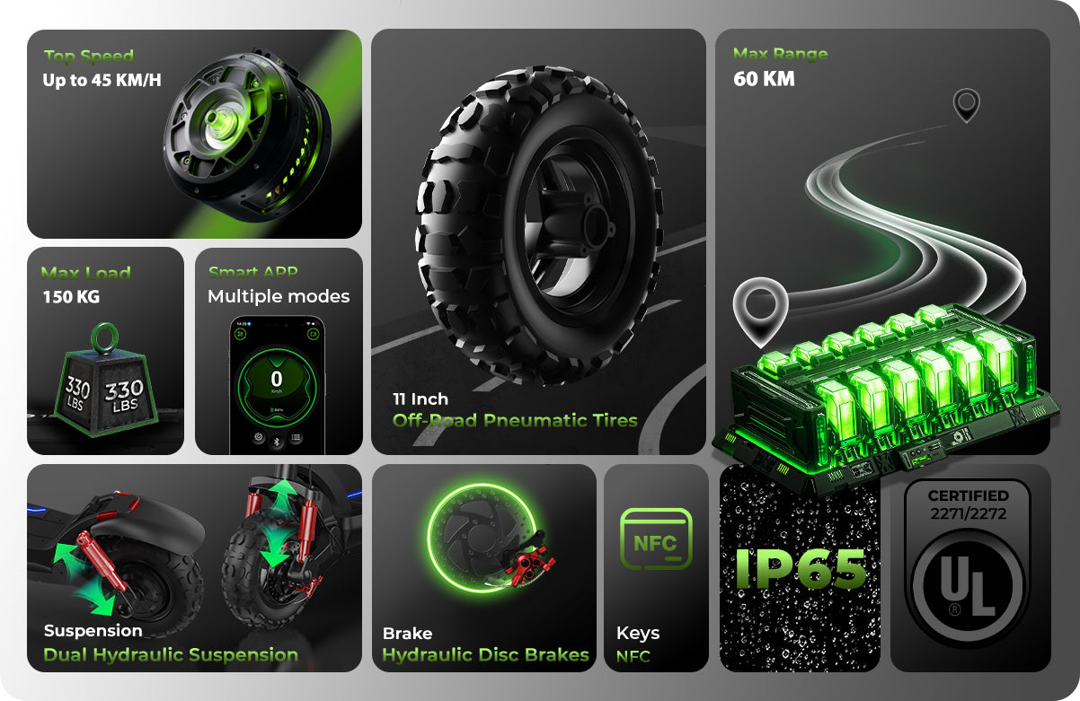 Pneu tout-terrain pneumatique de 11 pouces , suspension hydraulique double avant et arrière, frein EABS et frein à disque, facile à plier ,
