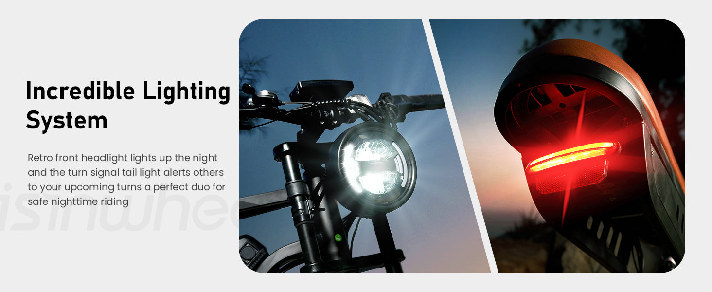 It comes with retro headlights and turn signals, ensuring clear visibility and safety during riding.