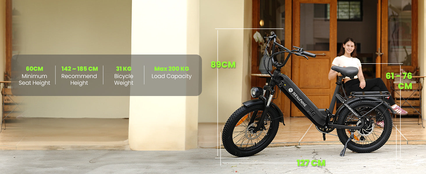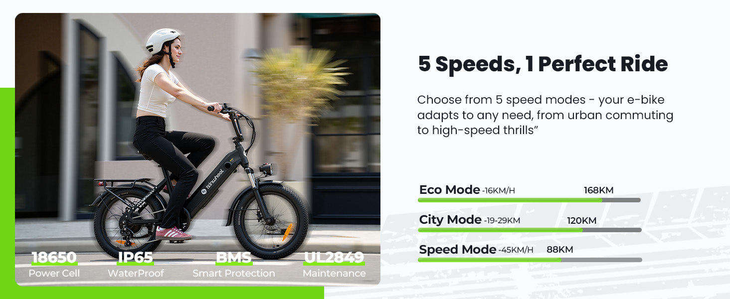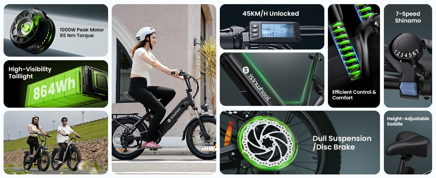 The isinwheel U8 combines city comfort with off-road capability. With wider 20”×3” tires, it delivers extra stability and grip on all kinds of roads. The 1000W motor provides strong acceleration and supports speeds up to 45 km/h, while the Step-Thru frame makes it easy to hop on and off — especially for riders of different heights or for women.