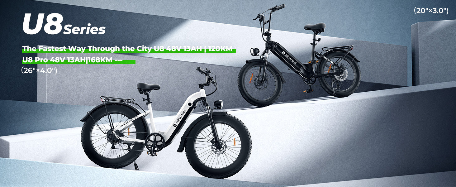 • U8 Pro: 1000W peak power, extended 168 km range, 20×3" tires — same size with a larger battery for longer rides.