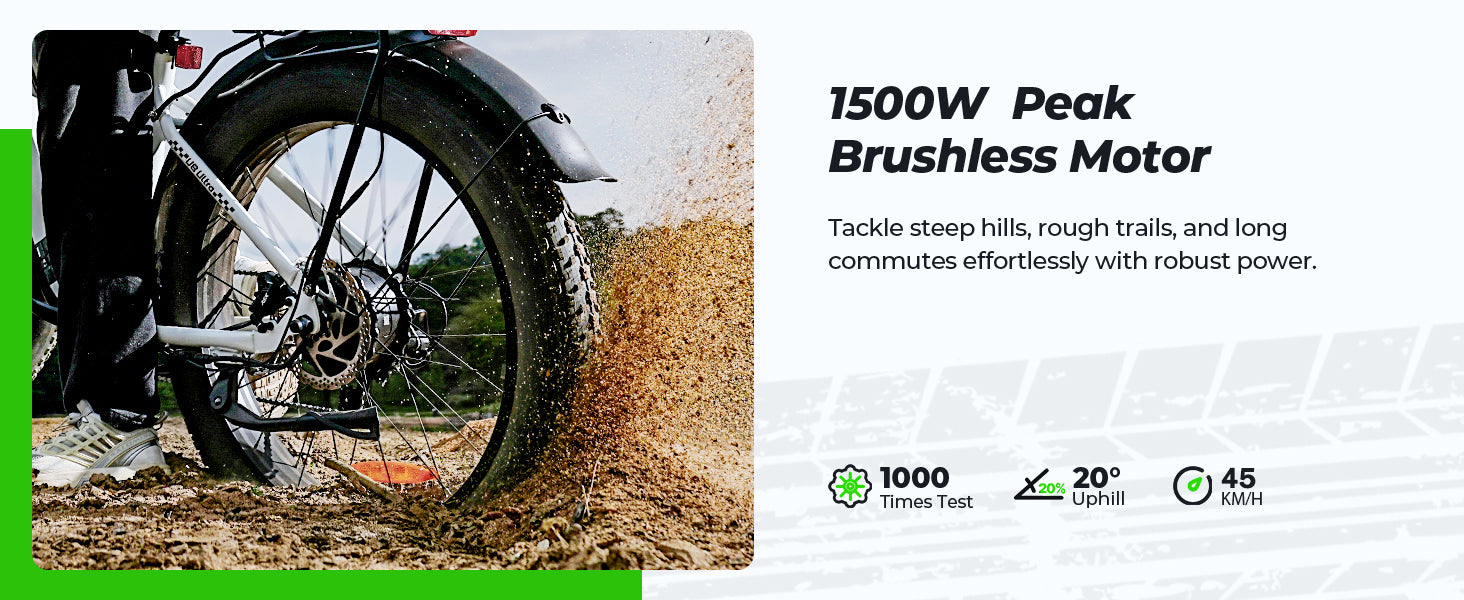 U8 Plus: 1500W peak power, up to 120 km range, 26×4" fat tires — bigger wheels and stronger motor for off-road versatility.