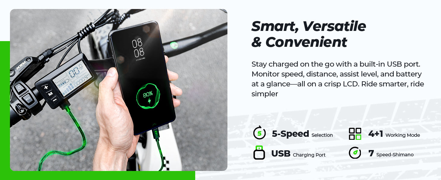 Yes, the U8 Series E-bike has a USB charging port on the battery. You can charge your phone at any time when you need.