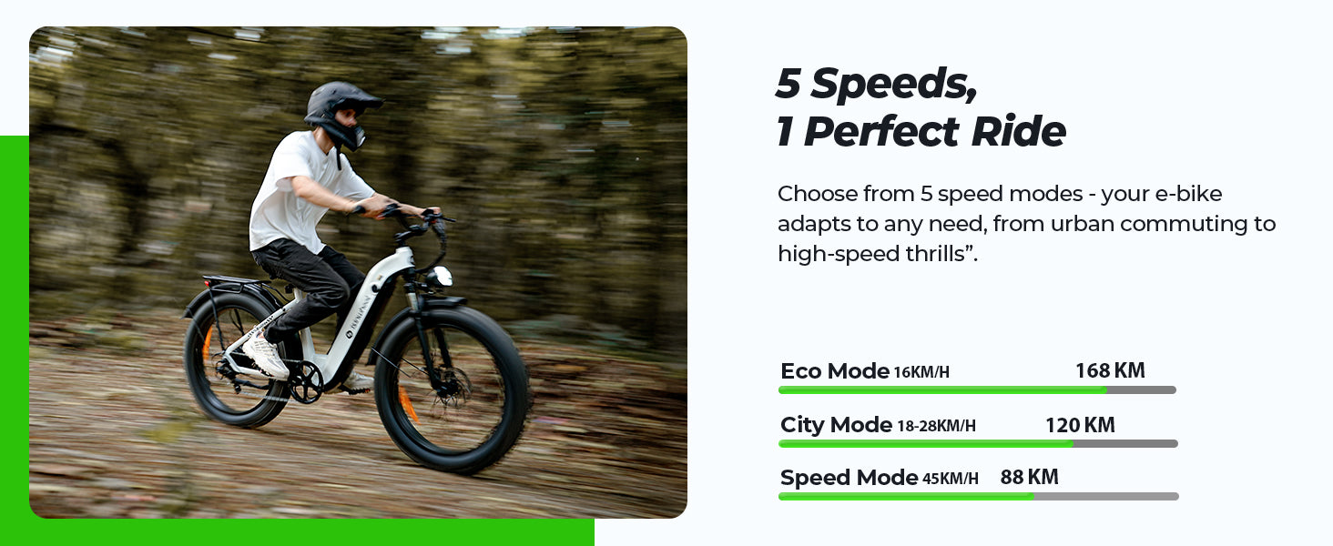 U8: 1000W peak power, up to 120 km range, 20×3" tires — compact and powerful for daily commutes.
